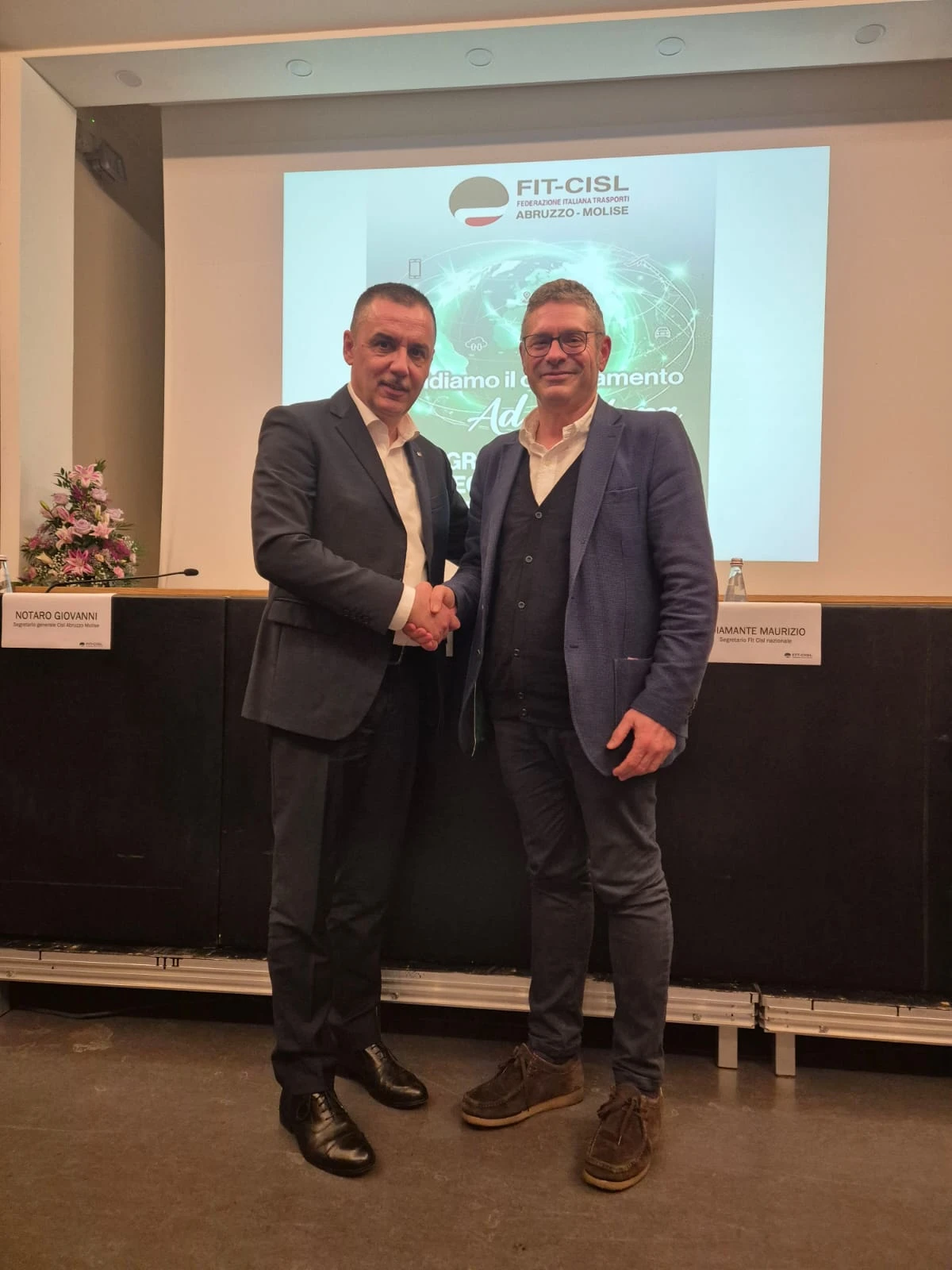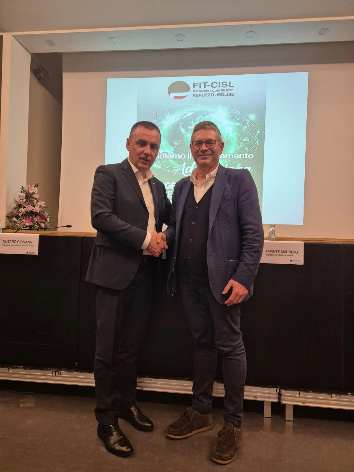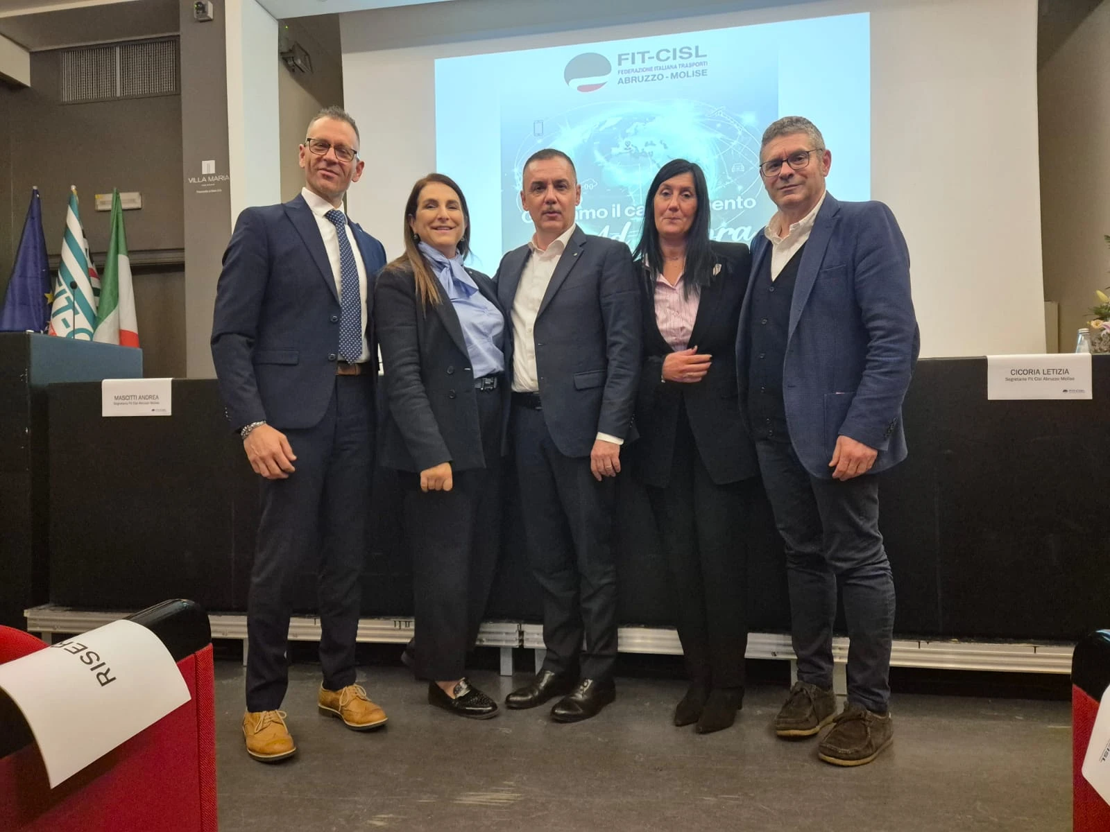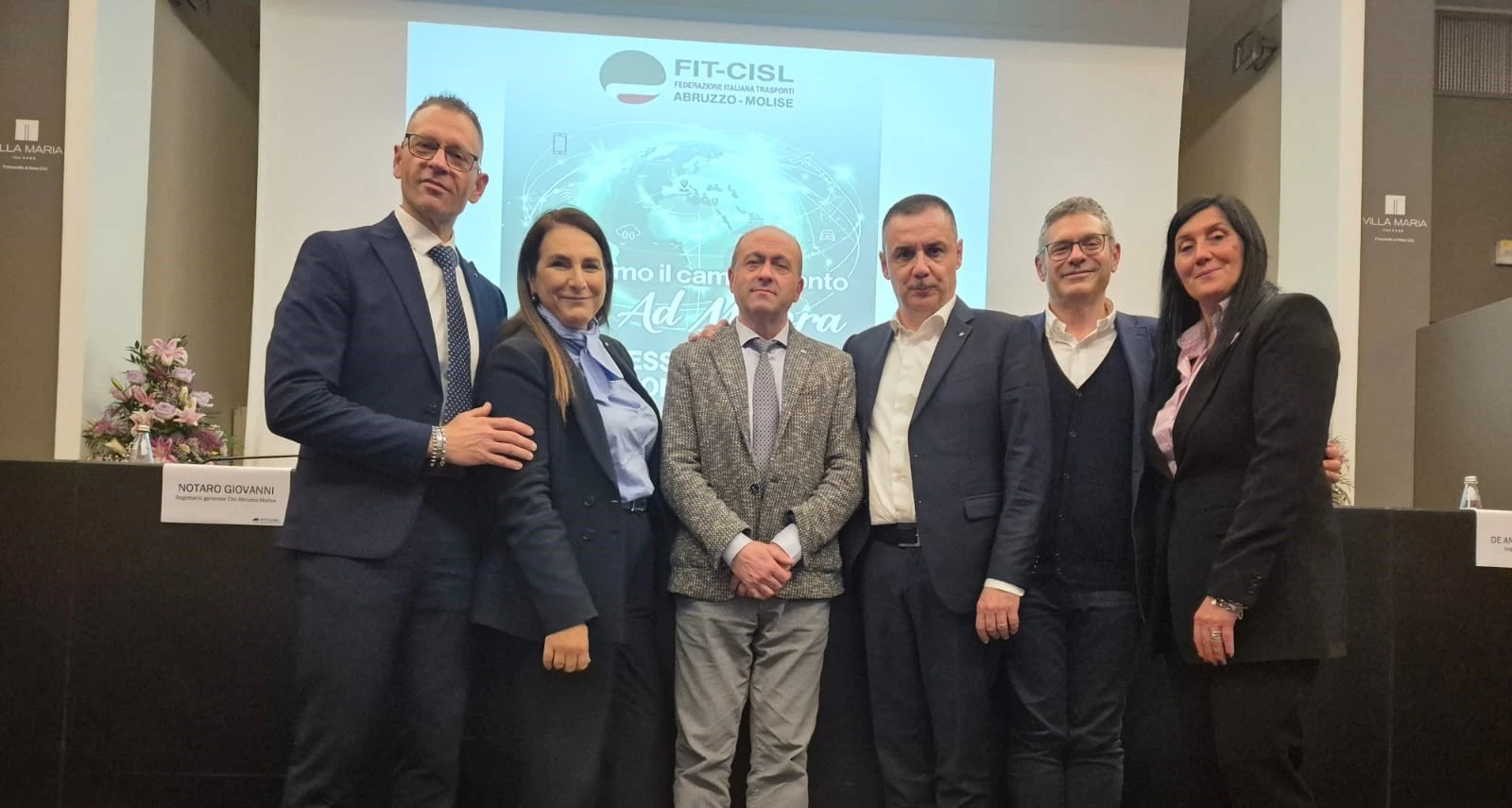 Amelio Angelucci è stato confermato Segretario Generale della Fit Cisl AbruzzoMolise e con la sua segreteria: Letizia Cicoria e Andrea Mascitti Auguri di buon lavoro da parte del Segretario Generale Cisl Giovanni Notaro che ha partecipato al IV Congresso della Fit Cisl AbruzzoMolise presso l’Hotel Villa Maria di Francavilla a Mare. "La legge sull partecipazione, in cui siamo stati impegnati responsabilmente come Cisl, è un'occasione di valorizzazione per il settore dei trasporti e dei servizi pubblici. L' Abruzzo e il Molise hanno un'opportunità imperdibile di investimenti infrastrutturali che si traducono in sviluppo economico ed occupazionale. Sono tante le sfide del settore dei trasporti, della logistica e dei servizi ambientali ma come sindacato siamo pronti ad affrontarle per rappresentare e tutelare i bisogni e le esigenze dei lavoratori puntando alla qualità, sostenibilità e sicurezza dei servizi erogati ai cittadini